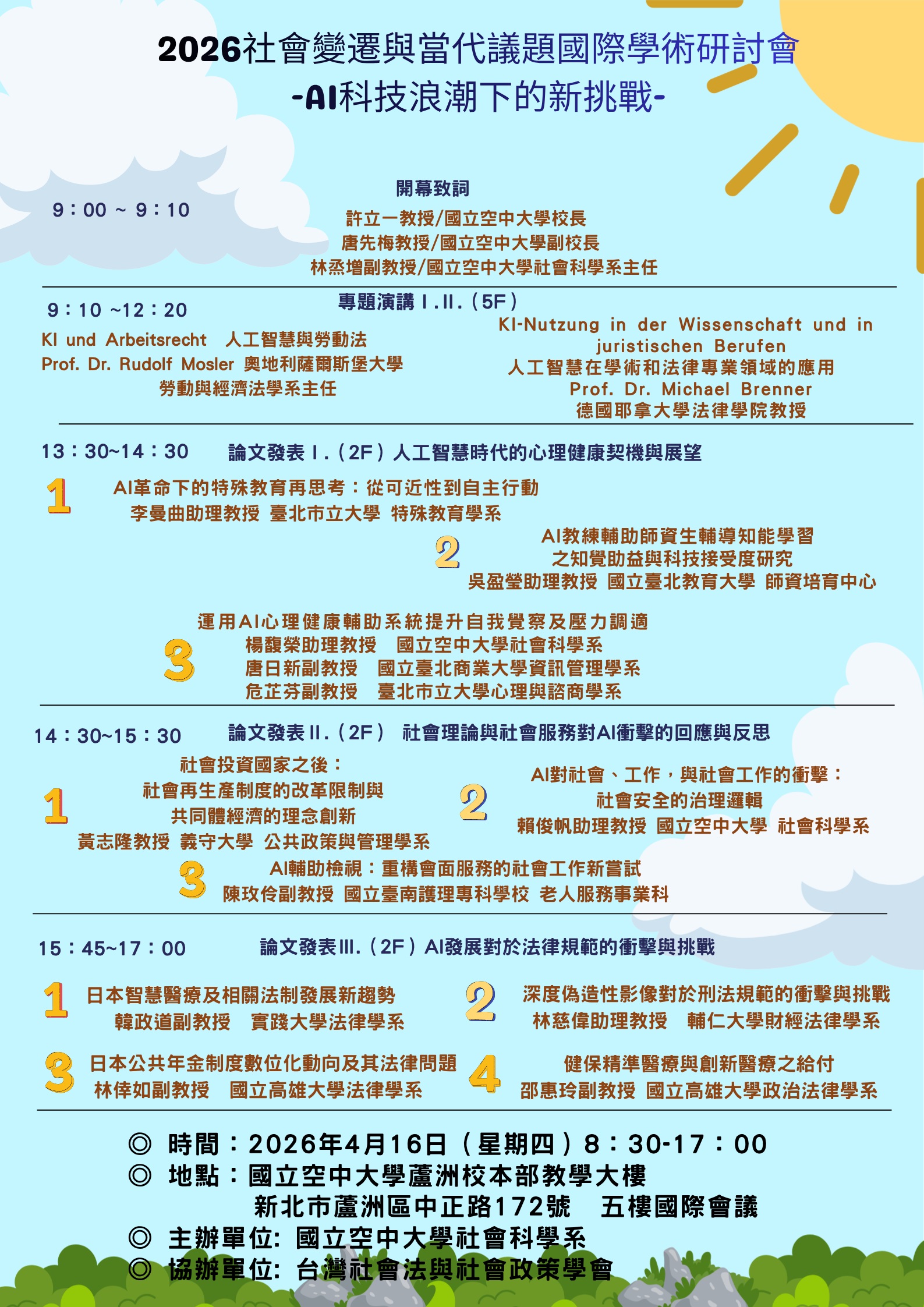 一、本校社會科學系與台灣社會法與社會政策學會於中華民國115年4月16日(星期四)8時30分至17時,在本校校本部教學大樓五樓國際會議廳及二樓智能會議室,合辦旨揭國際學術研討會,本次特別邀請奧地利薩爾斯堡大學勞動與經濟法學系主任Prof. Dr. Rudolf Mosler,和德國耶拿大學法律學院教授Prof. Dr. Michael Brenner蒞校專題演講。